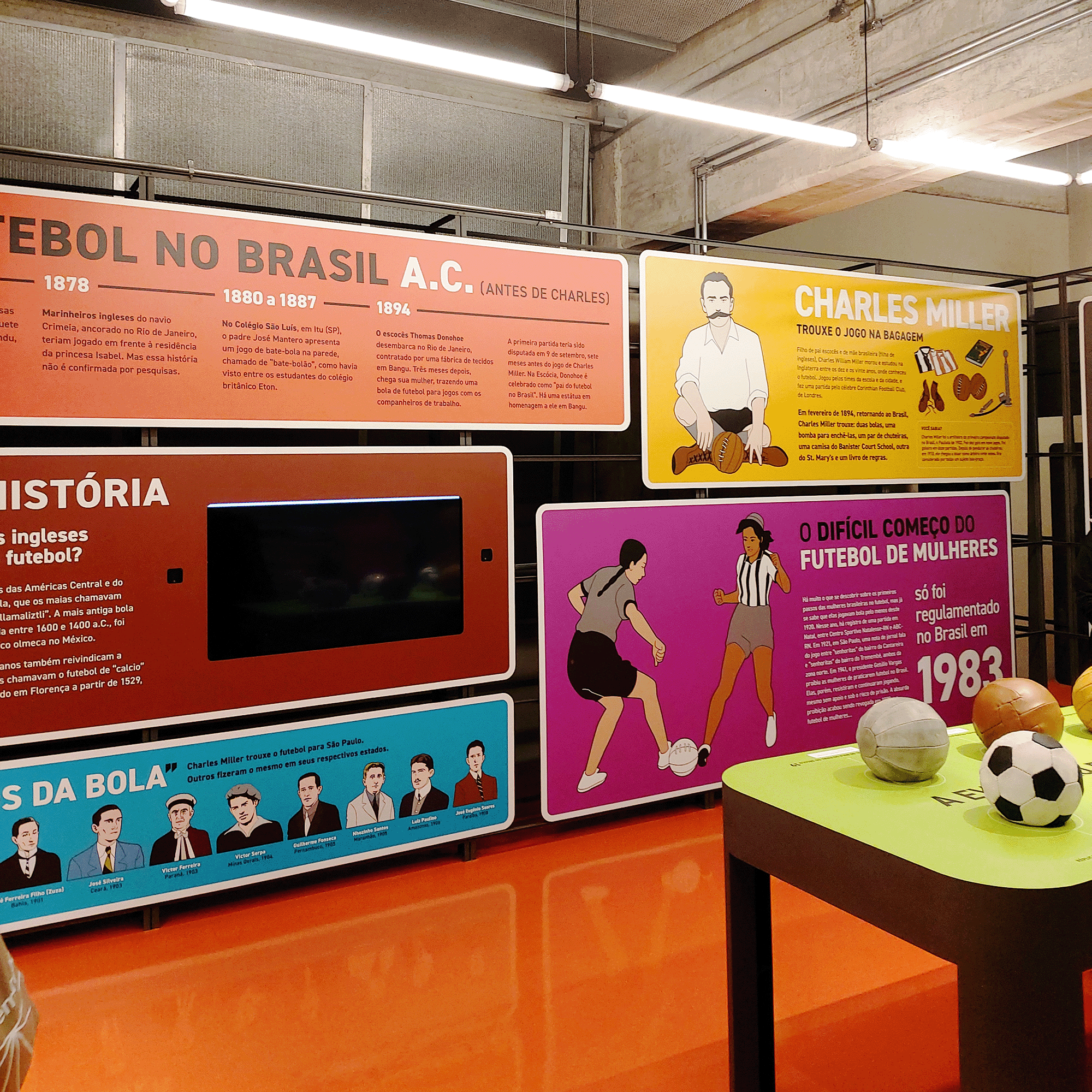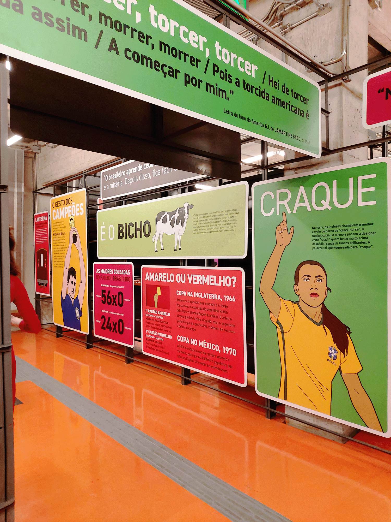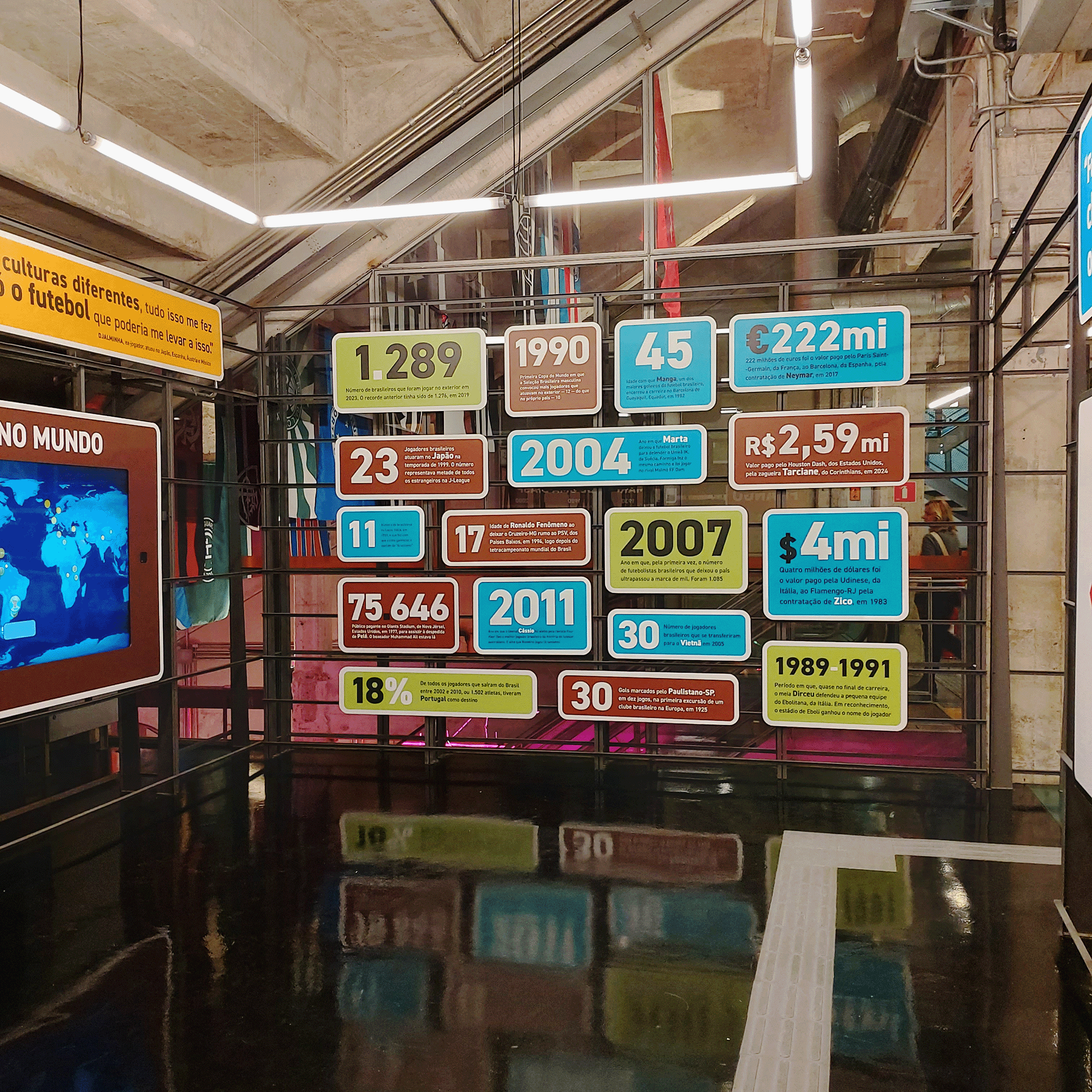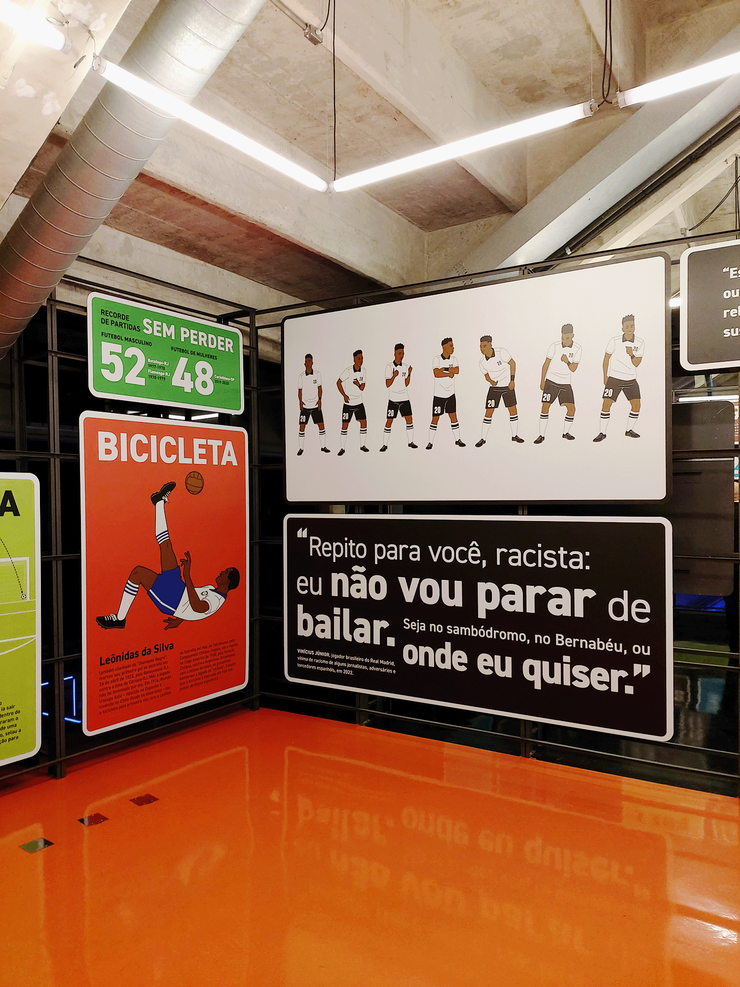 I was mainly responsible for designing the rooms of the “Almanaque da Bola” — a section that shares stories, curiosities, stats, and facts about Brazilian and world football. It includes more than 200 illustrated metal plaques in different sizes and colors, along with tables, display cases, and objects that form a journey through nine museum rooms.