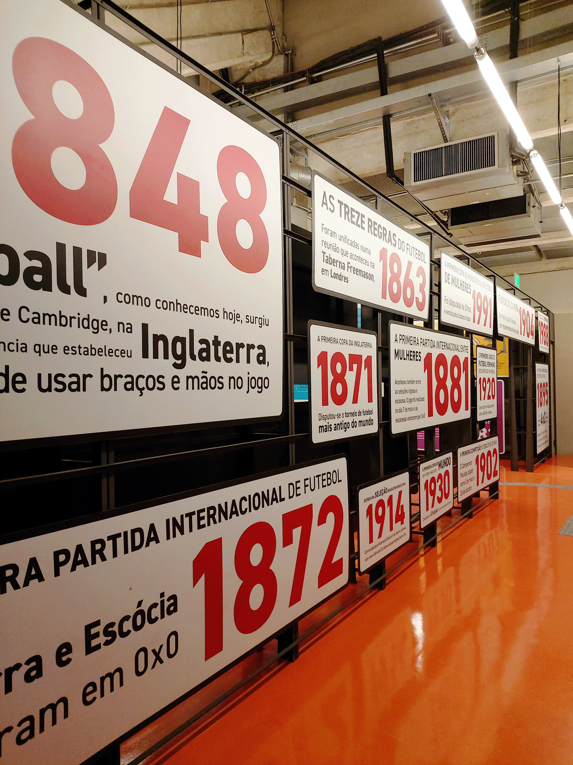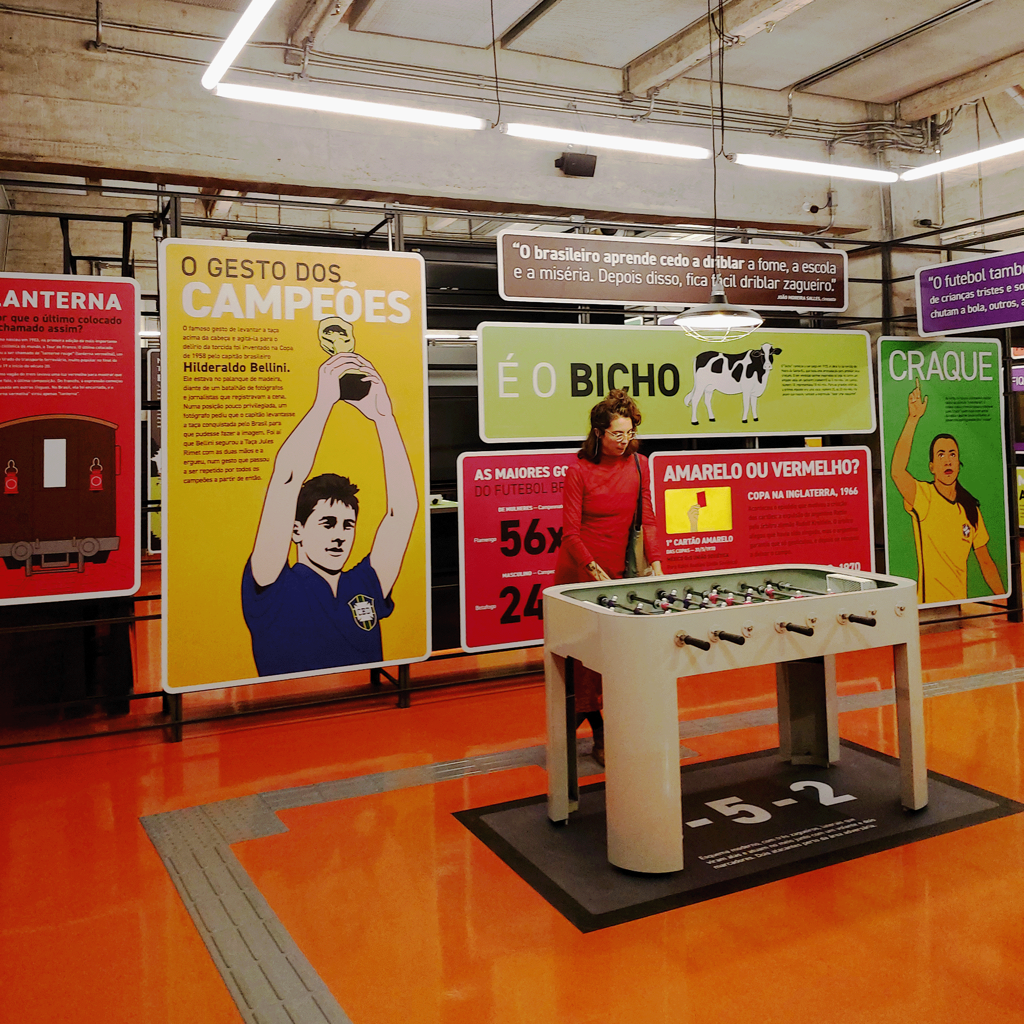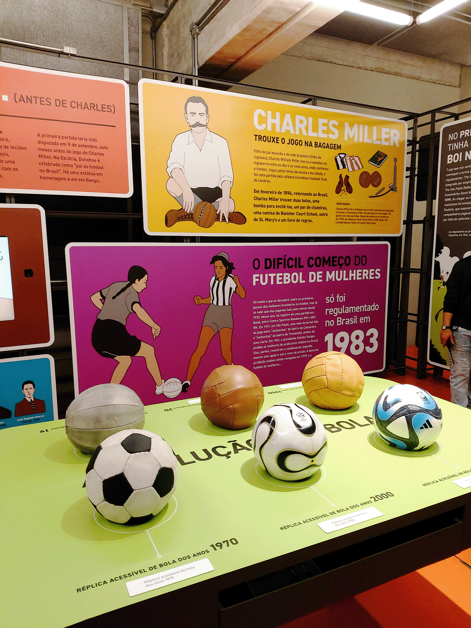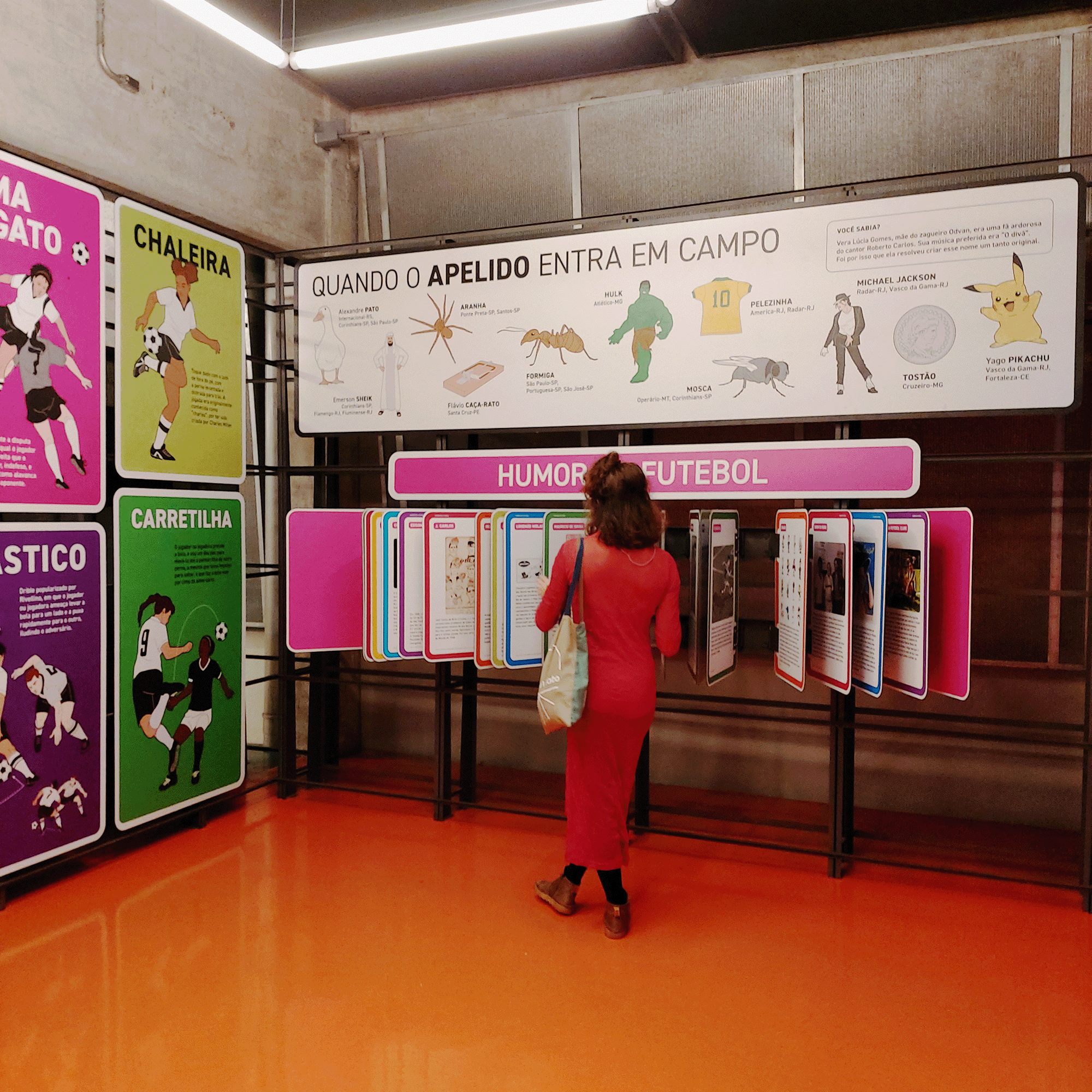 I was mainly responsible for designing the rooms of the “Almanaque da Bola” — a section that shares stories, curiosities, stats, and facts about Brazilian and world football. It includes more than 200 illustrated metal plaques in different sizes and colors, along with tables, display cases, and objects that form a journey through nine museum rooms.
