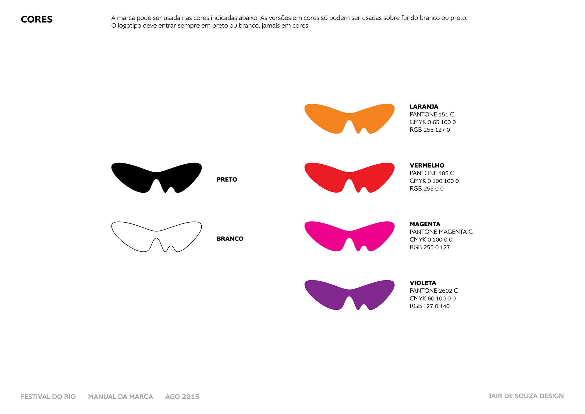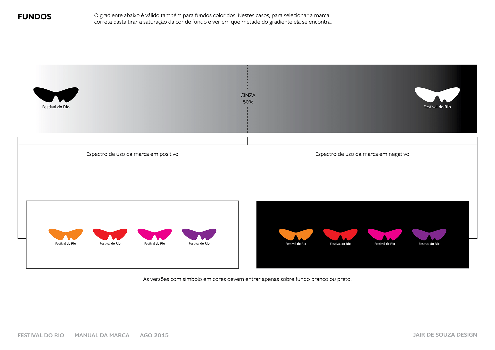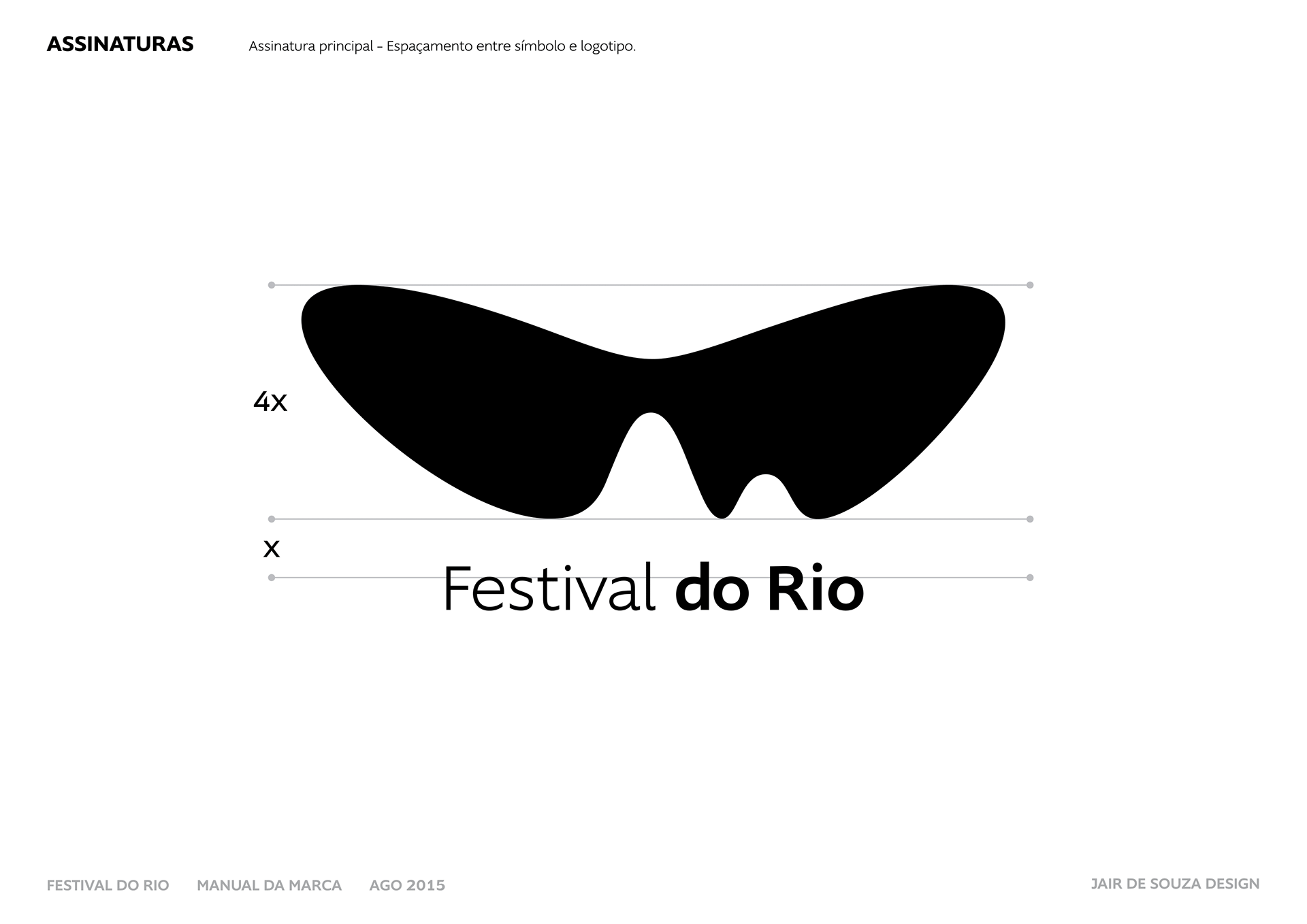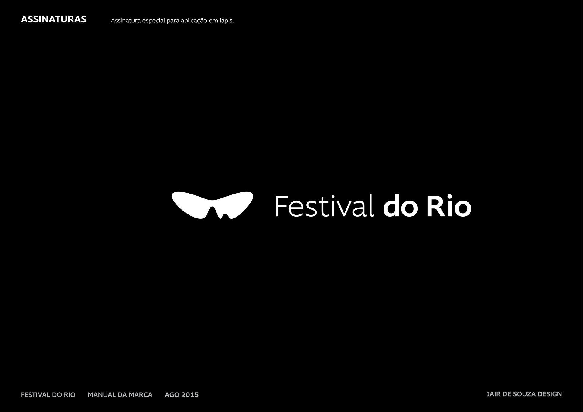 Neste contexto, fui encarregado de atualizar a marca do Festival, desenhado em 1999, sob orientação do próprio Jair. Fizemos uma série de pequenos refinamentos — no balanço do peso, na estrutura das curvas e na sensação de simetria —, alteramos a tipografia e, em seguida, desenvolvi o Manual de Aplicação da Marca, que ainda não existia, e todas as opções de marca auxiliares.