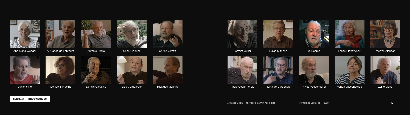 Entrevistas com Cacá Diegues, Daniel Filho, Jô Soares, Paulo César Pereio, Ferreira Gullar, Doc Comparato e mais personalidades da cultura brasileira, em especial da televisão e do teatro.
