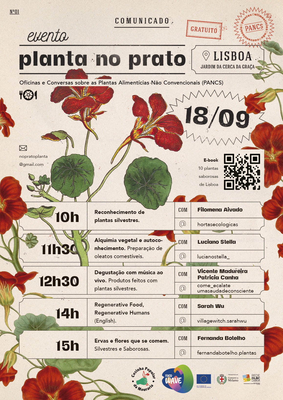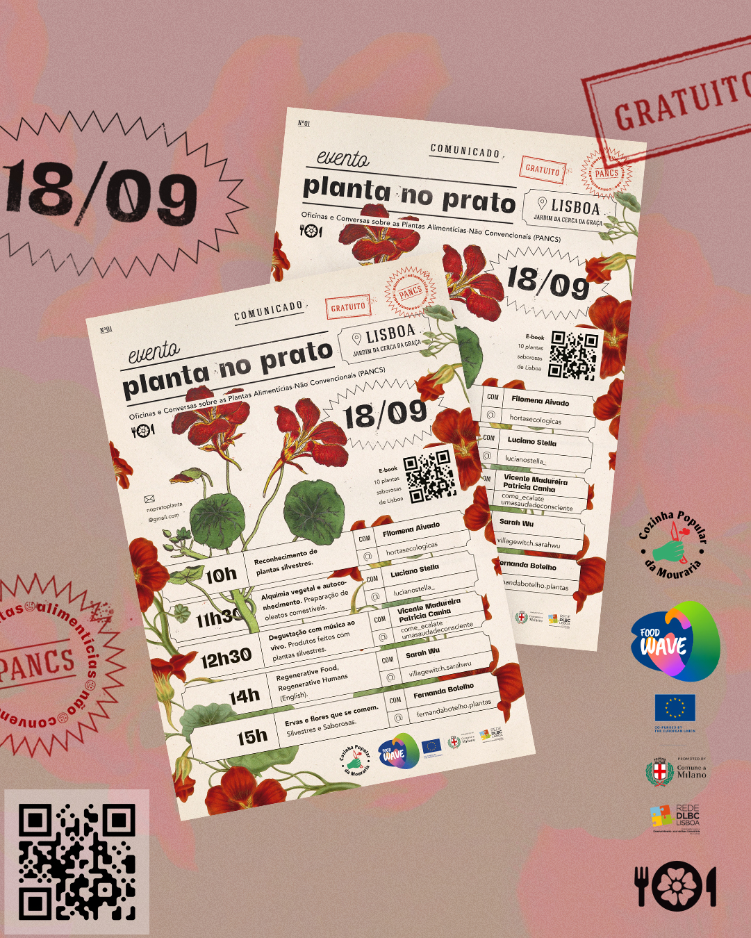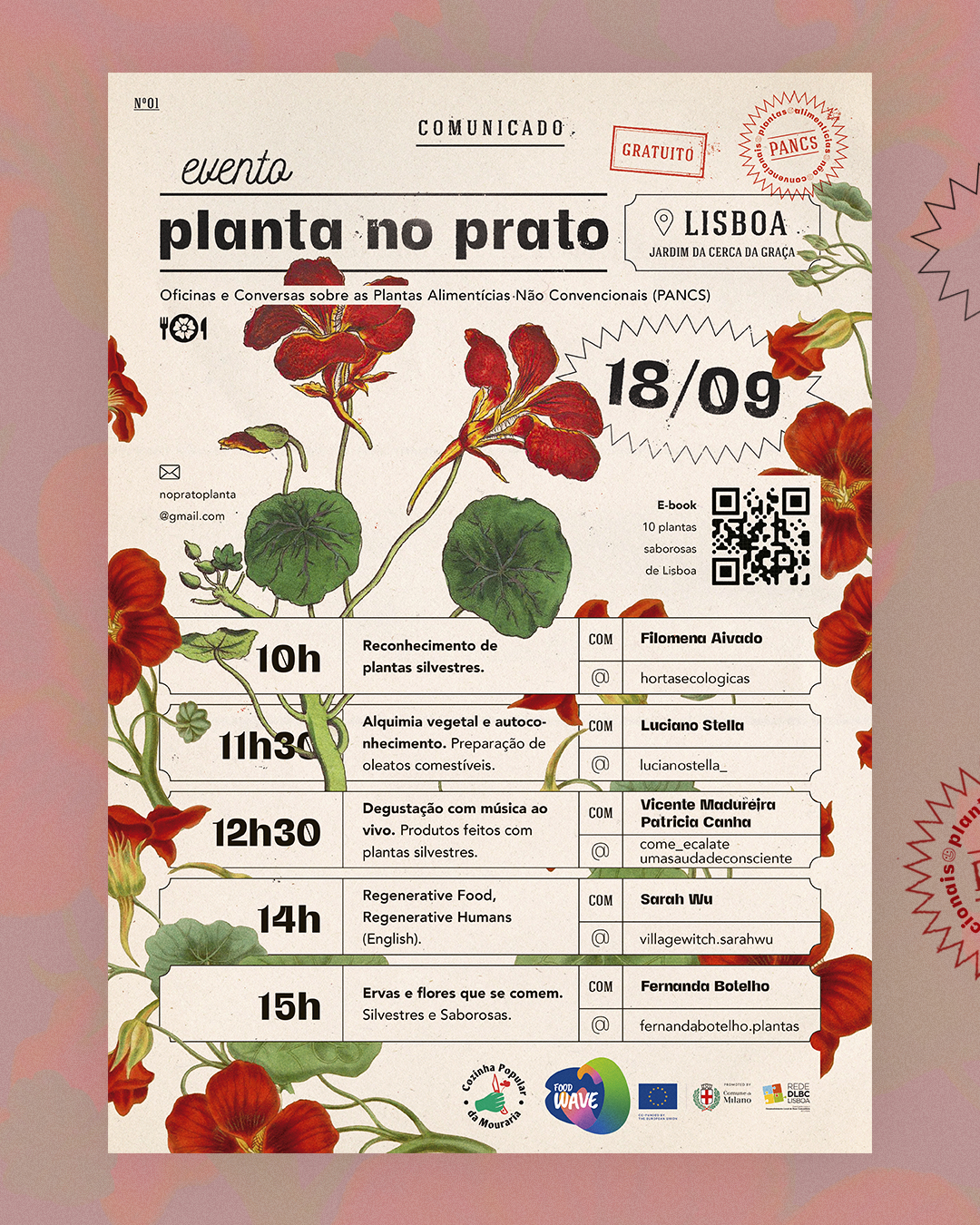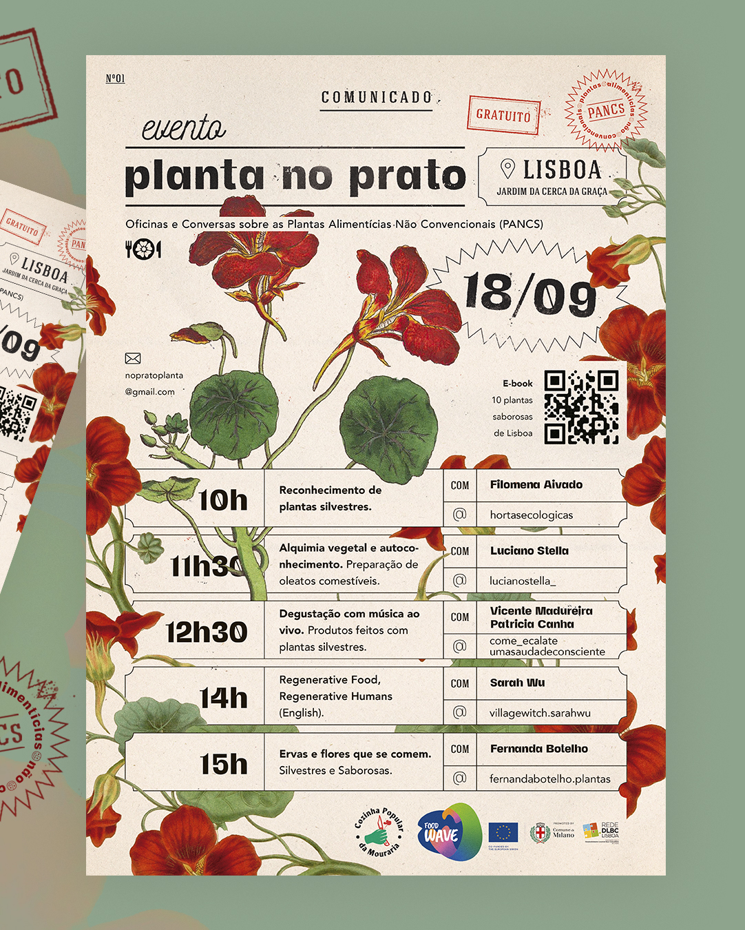 Printed poster and digital materials for the workshop “Planta no Prato — Workshops and Conversations on Unconventional Edible Plants (PANCs)”, held at Jardim da Cerca da Graça, in Lisbon, Portugal, in September 2022.